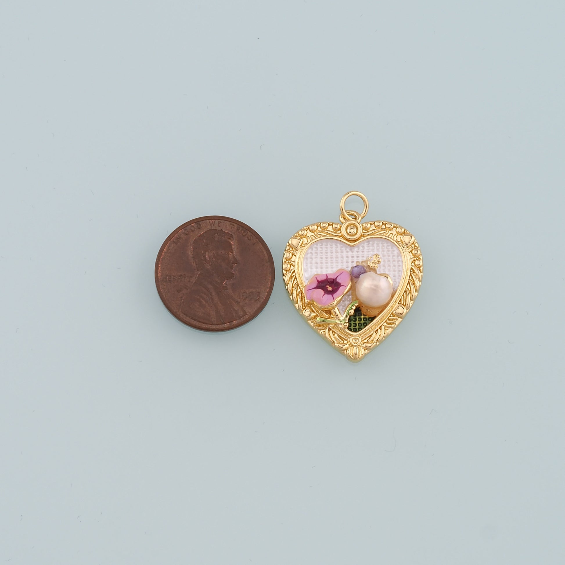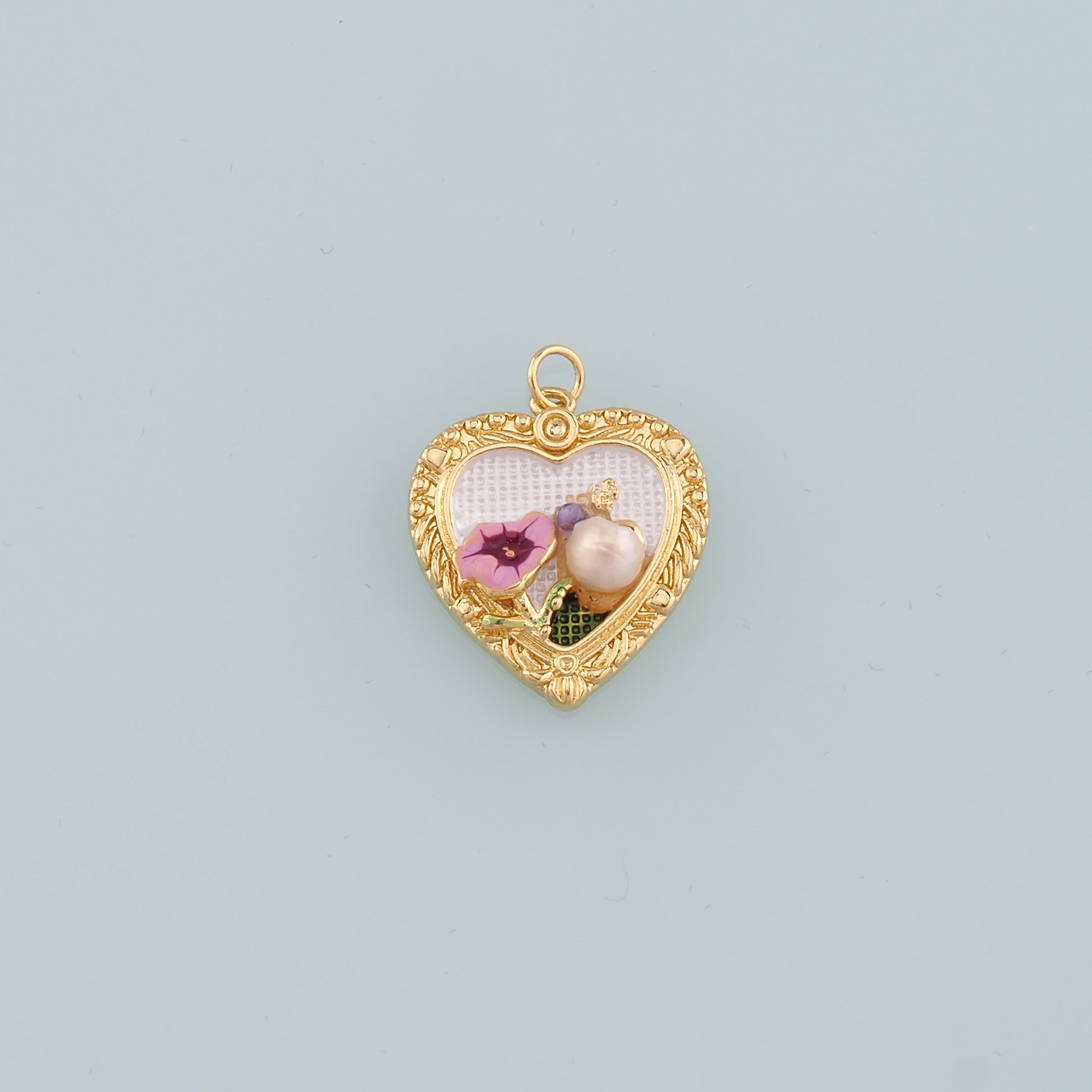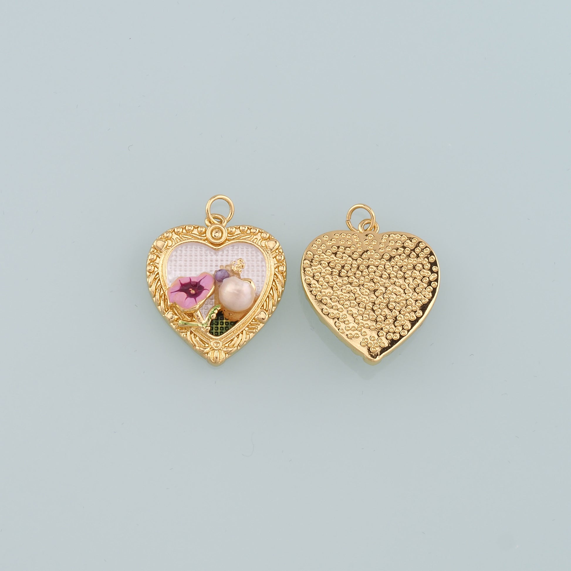 18K Gold Filled Pearl Heart Pendant,Enamel Heart Flower Charm Bracelet Necklace for DIY Jewelry Making Supply