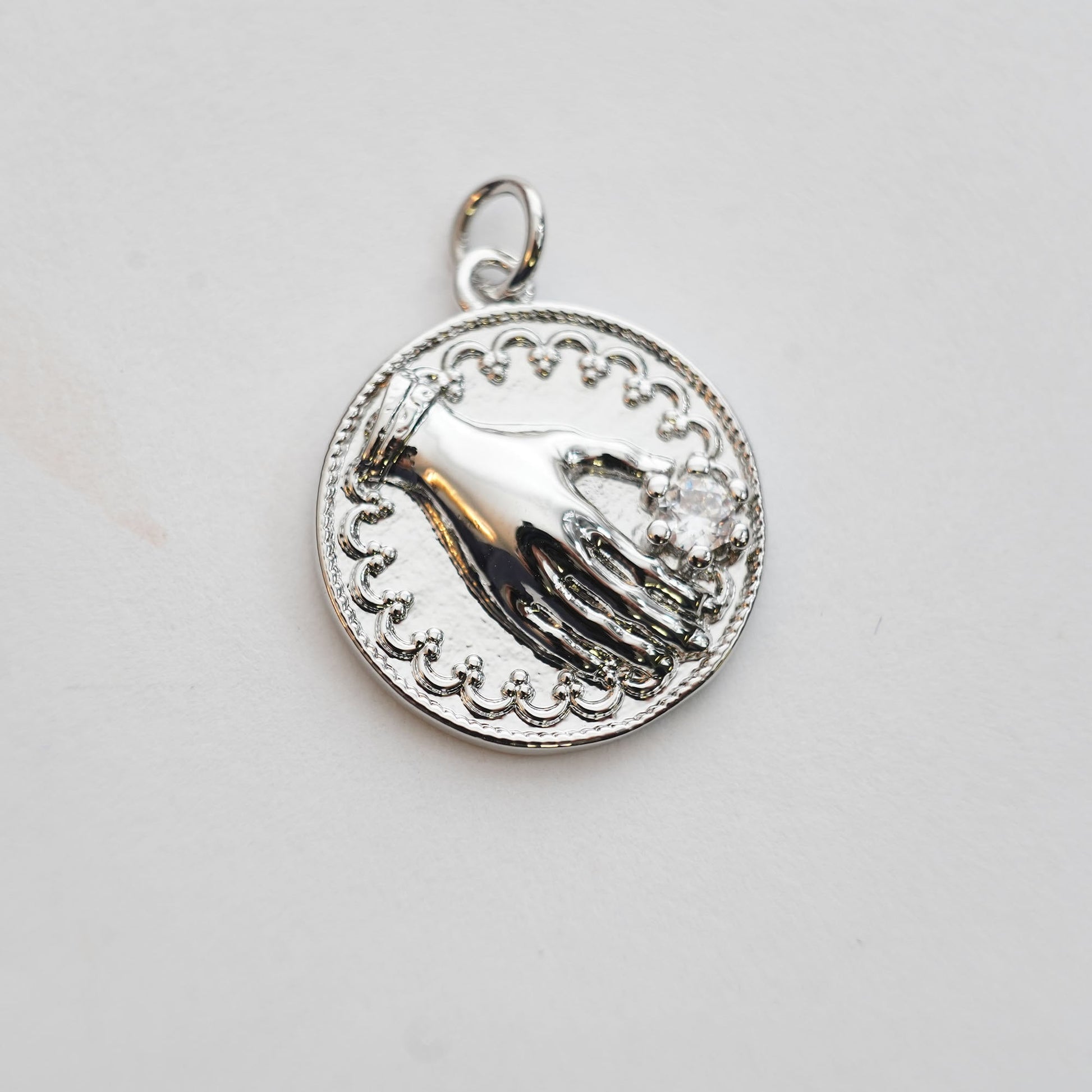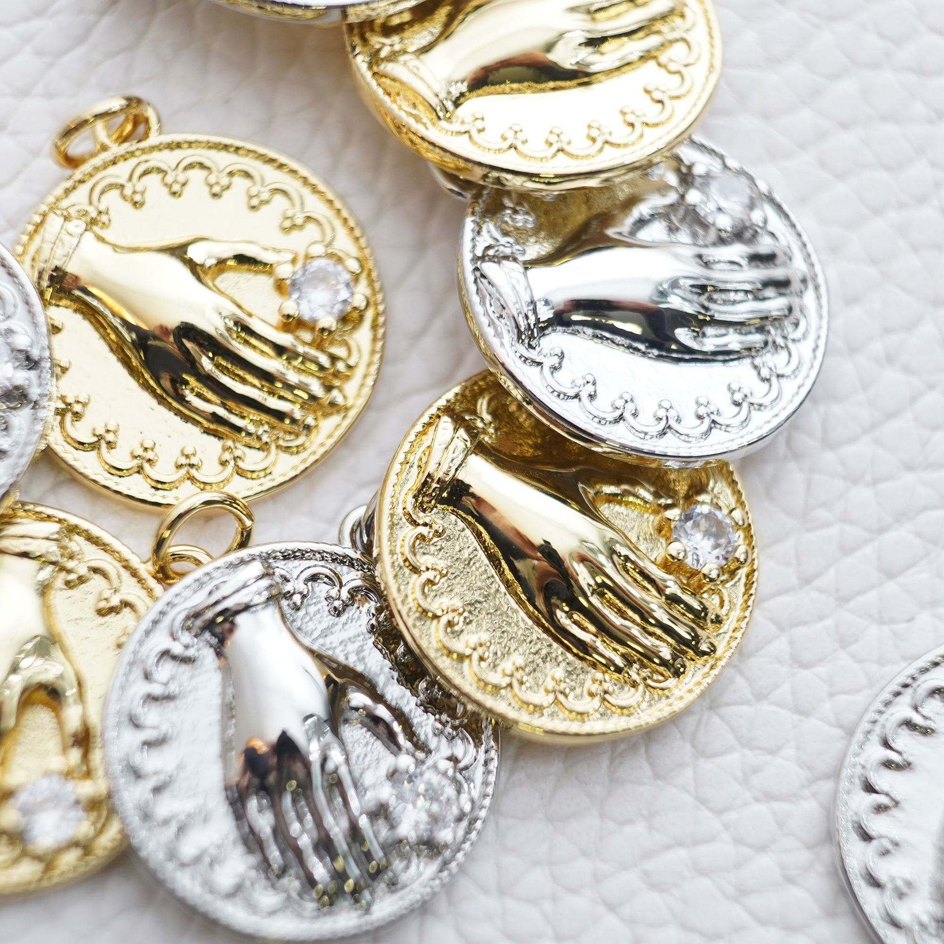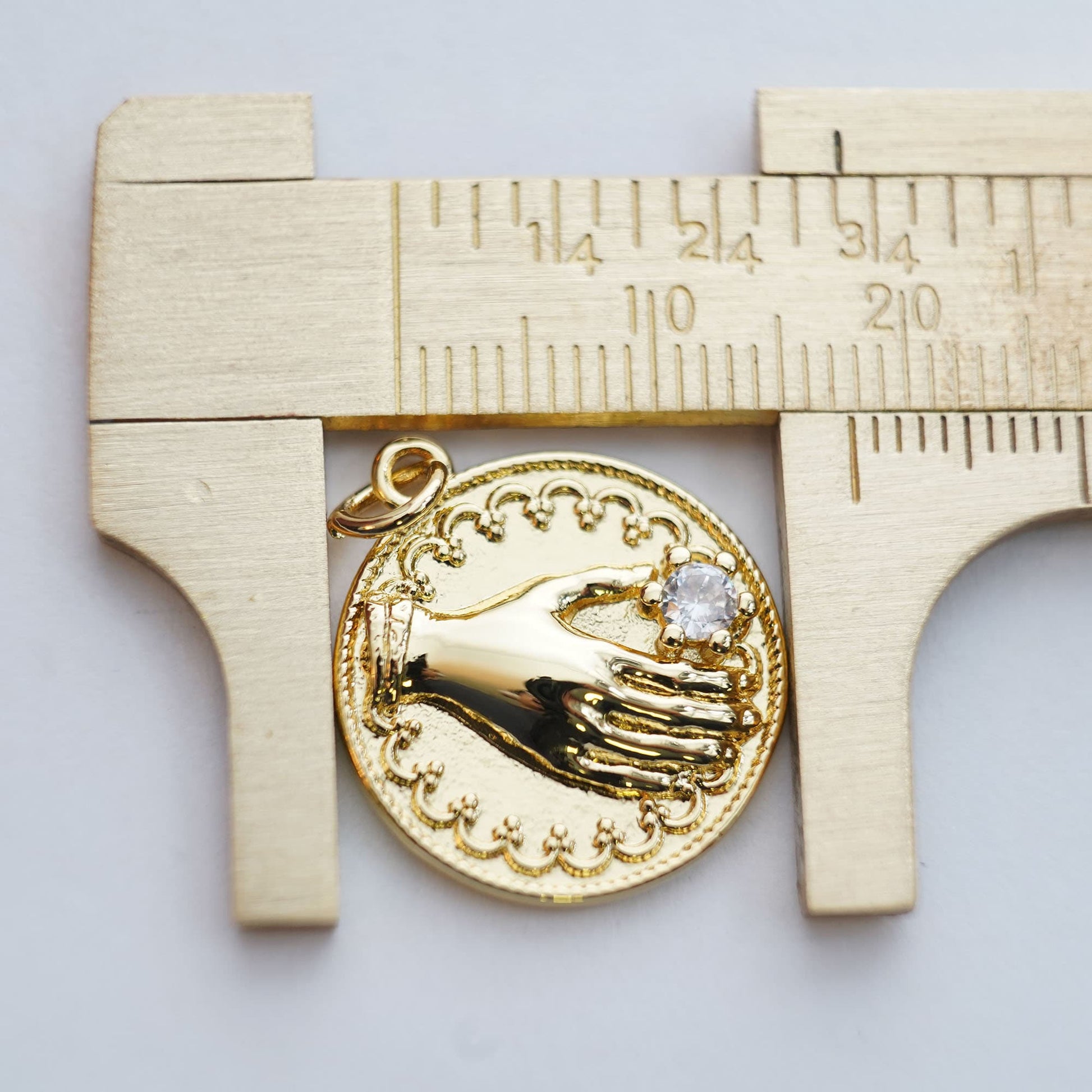 18K Gold Filled Round Hamsa Hand Pendant,Coin Hand Gesture Charm Necklace for DIY Jewelry Making Supply